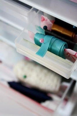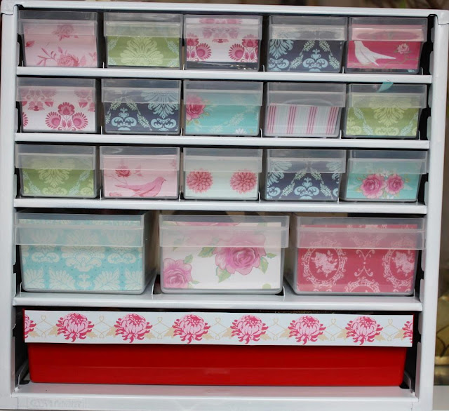 En liten skruv- och mutterhurts som spraymålats om och fått nya pappersfronter blir min första repris. För att göra det ännu lite finare har jag klippt till trådrullsformade pappersbitar och snurrat på olika bandstumpar som bara legat trassliga i en låda. Och med en knappnål hålls det på plats.