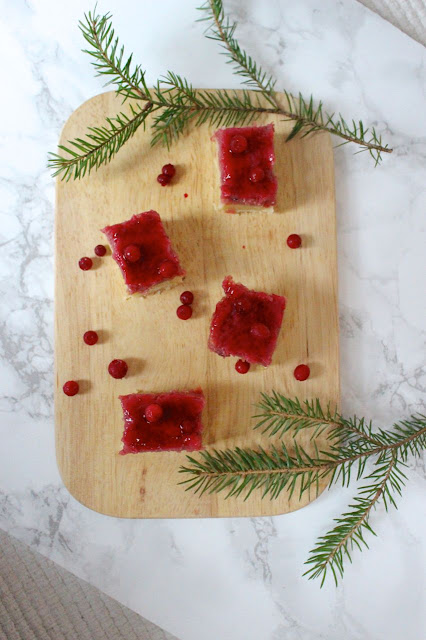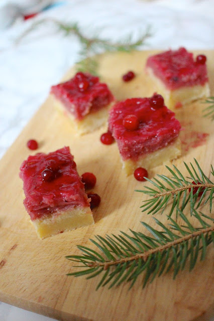 Receptet är från citronrutorna men han har bytt ut citronjuicen mot lingonjuice av våra egenplockade lingon för att få dem lite mer juliga.