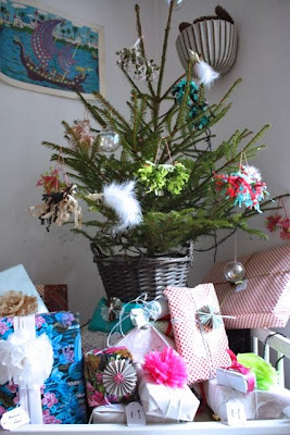 Paketen blev färglada i år igen med snurror och pompoms. Etiketterna vita och enkla med namn på den som skulle få på en sida och vem som gett det på andra. De har jag sparat i en ask tills nästa år.